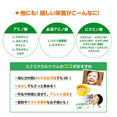 商品の特徴:カルシウム、マグネシウム、ビタミンD、ビタミンB1、ビタミンB6、ビタミンB12、亜鉛、たんぱく質、コラーゲン、アルギニン、オルニチン、クエン酸、CPP(カゼインホスホペプチド)