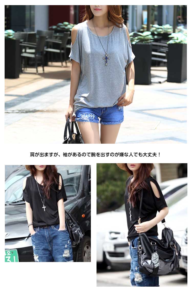 | 人気の肩あきデザインがゆるかわな雰囲気にピッタリなカットソー♪肩が出ますが、袖があるので腕を出すのが嫌な人でも大丈夫!ゆったりとしたドルマンシルエットで二の腕ほっそり見せ効果も◎ストレッチの良く効くとっても伸びる素材なので着心地もとっても楽ちん。身幅が広めで落ち感のある薄手生地が生み出すゆるっとしたシルエットがカワイイ!ショーパンからスキニーまでボトムを問わず着まわせるベーシックデザインです! | |