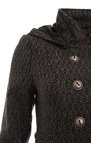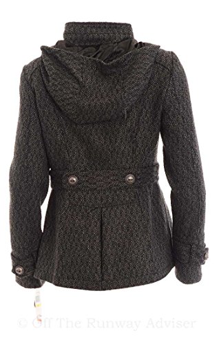 This coat by Celebrity Pink features stand collar, removable hood, double breasted button front closure, long sleeves, tabs at waist, on-seam pockets, pleated back hem, full lining, lightweight.Feature