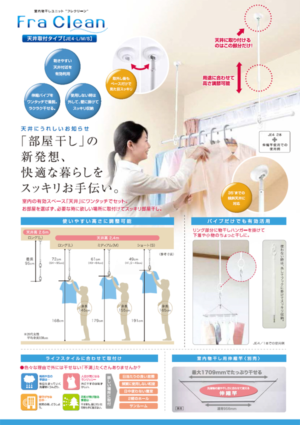 ●天井付けのメリット!乾きやすい天井付近を有効利用できます。取り外しても見た目スッキリ。パイプが伸縮すので取り付けもラク。