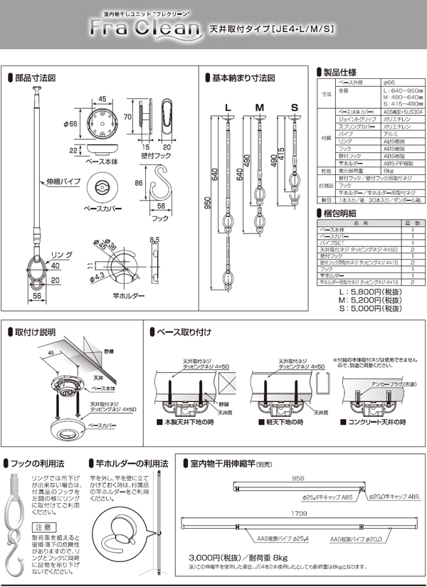 ●材質:【パイプ】アルミニウム合金【ベース(本体・カバー)】ABS樹脂、18-8ステンレス【リング・フック】ABS樹脂