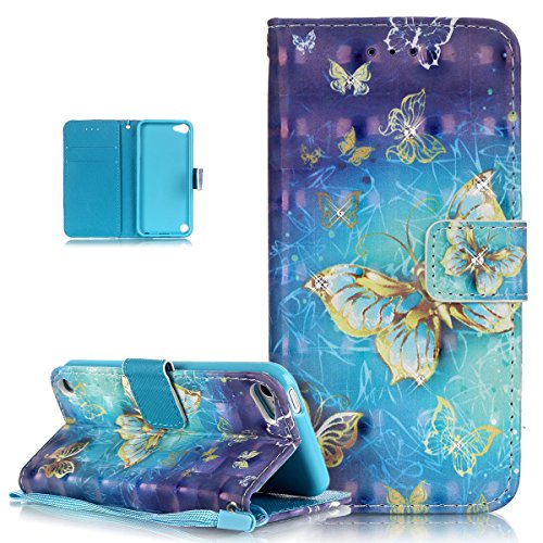 iPod Touch 6 Case,iPod Touch 5 Case,ikasus Shiny Glitter Diamond Colorful Art Painted PU Leather Flip Wallet Pouch Stand Credit Card ID Holder Case Cover for Apple iPod Touch 5/6,Blue Yellow Butterfly