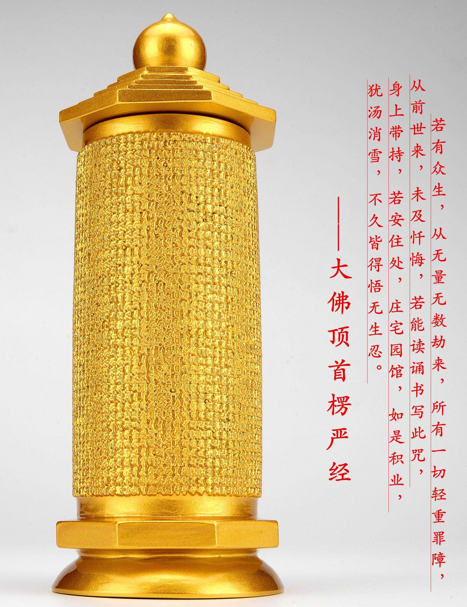 据《法灭尽经》云,在佛法将要消亡的时候,是楞严先灭的。只要世上还有楞严咒,就还有佛法的存在。在楞严咒消亡的时候,就代表佛法也要消亡了。到时候世间将灾疫横生,洪水滔天,生灵涂炭。所以,护持楞严,令正法长久驻世,是十分重要和有意义的,是每个佛弟子都应尽的义务。有感于此,福慧弘法小组采用纯黄铜,把整篇楞严神咒凸铸于幢身上,令楞严神咒的每一个文字,都化为千古不坏的立体铜字。愿大众为了佛法不灭,恭敬迎请,或劝他人请,广宣流布,世代相传。此极具意义和功德无量之举,自然能令诸佛欢喜,龙天拥护,自身及子孙后代,获福无量! 楞严经云,各家各户,安放此楞严咒幢,一切灾厄悉皆销灭;在在处处,国土众生,随此神咒,天龙欢喜,风调雨顺,五谷丰登,万民安乐;又能镇压一切随方变化的 恶星,使得灾障不生,人民没有横死夭亡,牢狱之苦,还能昼夜安睡,没有恶梦;如有众生,从无量劫以来,所造轻重罪障,从前世带来,还未能及时忏悔的,如安 此神咒于庄宅园馆等住处,这些多劫以来所造的宿业,就如雪遇沸汤,即时溶化,终能证得无生法忍!