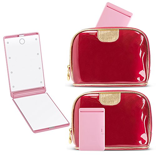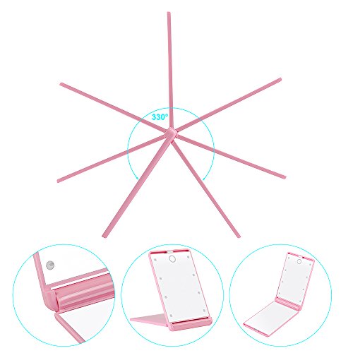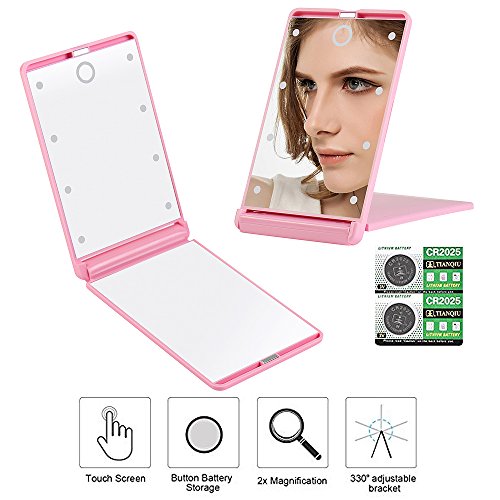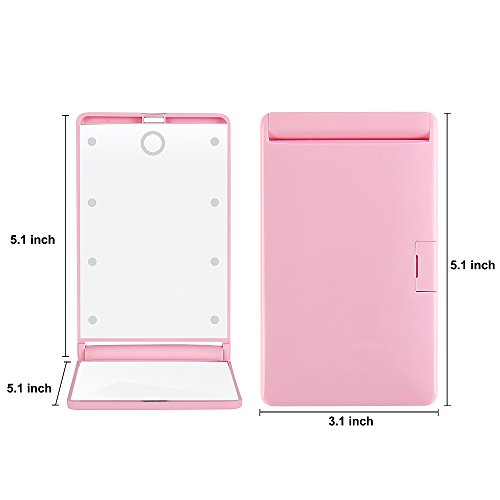 Travel Makeup Mirror with 8 Dimmable Led Lights,Compact Portable Touch Switch Mirrors,Fcebsty LED Lighted Pocket Mirror ,2 x magnifying(PINK)