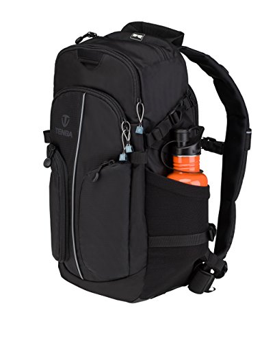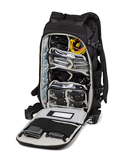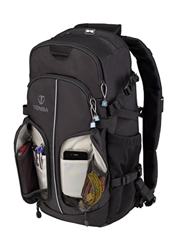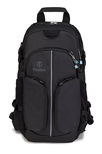 Rear access to the main compartment allows cameras, mounts and accessories to be swapped out without removing the bag from your body, and can all be done even when on a bike or a snowboard.Four internal pouches organize cameras (up to four GoPros), and a ton of mounts, backs, housings, cables, batteries and other accessories. All pouches velcro to the back wall of the interior for easy organization and removal.Tethered tool wallet provides quick access to batteries (up to 4), pivot arms and thumb screws.A second tethered media wallet stores up to six SD or Micro SD cards.Middle sleeve fits a Camelbak or similar style hydration reservoir up to 100 ounces, or can be used for a full-size tablet.Front pocket stores an iPad Mini , Kindle or similar sized small tablet.Top zippered pocket for sunglasses is lined with soft brushed tricot.Side clips to attach a helmet.Dual front accessory pockets fit small accessories, and include D-rings to tether media wallets.Tenba's Exclusive Pivot-Fit™ Harness Straps automatically adjust to different shoulder shapes for a custom fit.Durable hypalon straps to attach a compact tripod to the bottom of the bag.Deep micromesh side pockets fit monopods, large water bottles, gloves or other items you need to get at quickly.Adjustable trolley strap can be attached to the handle of a rolling case for secure piggyback travel through an airport.Meets carry-on requirements for all international flights, and will fit under the seat of an airplane even when fully loaded.Included accessories: 6-card media wallet...