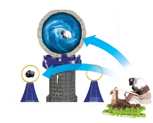 -. Feature : Buildable castle with working launcher, collapsing wall, swiveling throne, interior courtyard with Kaos fountain and more / Working catapult and castle ring vortex / Buildable Kaos (Evil Portal Master) and Glum shanks (Kaos' Trusted Minion) / Buildable Bouncer (Tech Giant) and Igniter (Fire Skylander) / Two white sheep and one exclusive black sheep, cheese, pizza and treasure chest
