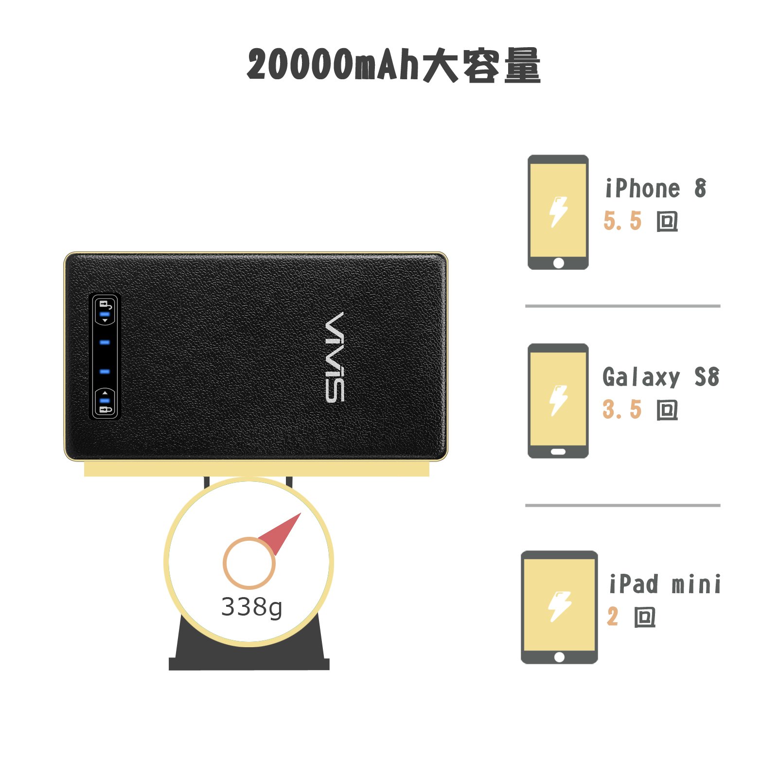If you have an extremely large capacity of 20000 mAh, you can quickly charge it to iPhone 8 about 5.5 times, Galaxy S 8 about 3.5 times, iPad mini about 2 times.
