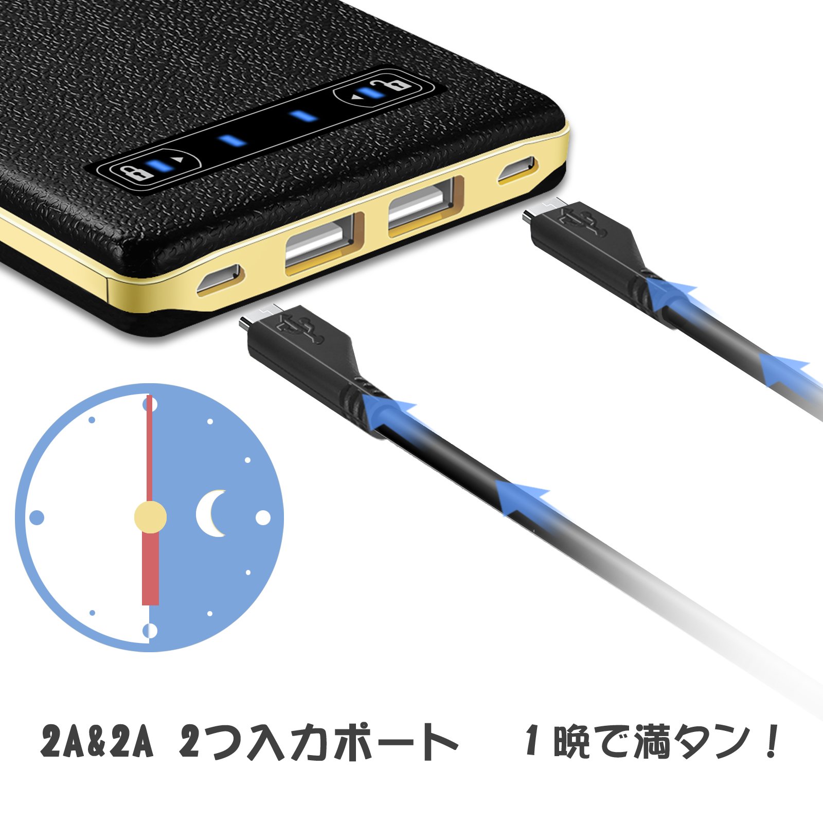 Considering that it takes a long time to charge large capacity batteries, if there are two Micro USB input ports, you can fully charge the main body for 6 hours with 2 adapters (5 V / 2 A).