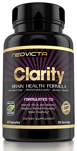 -. Binding : Health and Beauty -. EAN : 0784672343275 -. Feature : ▶ AMAZON'S MOST POWERFUL COGNITIVE ENHANCER - Formulated by nutrition experts, Clarity skilfully combines 40+ Earth-grown ingredients for fast-acting, tangible results. The secret? A combination of carefully selected nutrients that work in perfect synergy to support overall cognitive health and performance. Simply put, Clarity takes the guesswork out of choosing a brain supplement. This is the most complete, balanced nootropic available today. Results come standard. / ▶ ELEVATE PERFORMANCE WITH NO CRASHES OR JITTERS - Enjoy the benefits of dramatically improved concentration without the 'jag' or 'speediness' of coffee, energy drinks, or other artificial stimulants. Hundreds of delighted customers report an increase in mental drive, sharper focus, and noticeably clearer thinking after using Clarity. Beat the fog without the side-effects. / ▶ ON TOP OF YOUR GAME, NO MATTER WHAT - Are you studying for a big exam? Prepping for a performance? Maybe you're just looking to minimize tiredness, or increase your day-to-day productivity levels? Clarity users range from college students and busy moms, to athletes and business professionals. No matter who you are, and no matter what your circumstances, we truly believe that this product can help streamline your life. / ▶ GOLD STANDARD PRODUCTION - Quality and safety are everything to us. That means performance-safe nutrients only, with no fillers, no binders, and no artificial ingredients. We only use high quality clinically-tested ingredients, all of which are condensed into capsules in a state-of-the-art USA facility, with strict adherence to good manufacturing practices (GMPs). Rest assured that you are always getting the best from us. / ▶ IRON-CLAD MONEY BACK GUARANTEE - We stand behind everything that we produce. If you are not 100% thrilled with Clarity, simply send the empty bottle back to Amazon within 30 days for a full refund. That's how confident we are in the efficacy of our products. Buy with complete confidence, risk-free. -. IsAdultProduct : 0 -. Label : Neovicta -. Manufacturer : Neovicta -. ProductGroup : Health and Beauty -. ProductTypeName : HEALTH_PERSONAL_CARE -. Publisher : Neovicta -. Studio : Neovicta -. Title : #1 Brain Supplement Nootropic - Mind & Energy Booster - Clarity by Neovicta - Improve Focus, Memory & Mood - Promotes Superior Brain Function in Men & Women - 30 Day Supply - Money Back Guarantee -. UPC : 784672343275