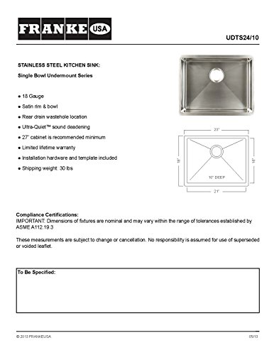 Kindred UDTS24/10 Hand Fabricated Single Bowl Under Mount Kitchen Sink, Stainless Steel