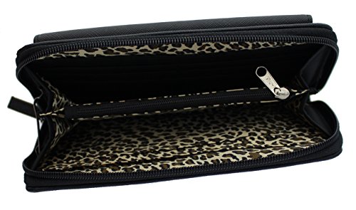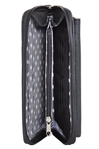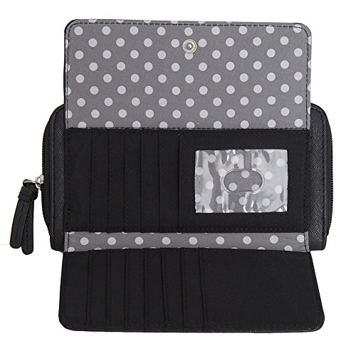 -. Feature : Style: Clutch wallet / Dimensions: 5 inches high x 9 inches long x 4.2 inches deep / Exterior color/pattern: Faux leather / Lining: Polka-dot print fabric / Entry: Zip-around