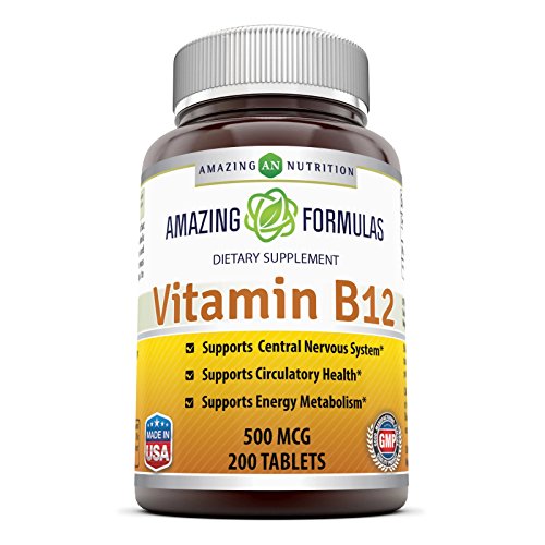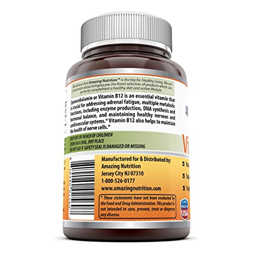 -. Feature : BENEFIT FROM VITAMIN B12Cyanocobalamin or Vitamin B12 is an essential vitamin that is crucial for addressing adrenal fatigue, multiple metabolic functions, including enzyme production, DNA synthesis and hormonal balance. *Vitamin B12 supports healthy nervous, cardiovascular health and also helps to maintain the health of nerve cells. * / THE EASY WAY TO ADD B12 TO YOUR DIET Our B12 tabletsmakes it easy for you to increase the amount of Vitamin B12 in your diet without any hassle. Every tablet provides an optimum dosage of 500 mcg of vitamin B12 (Cyanocobalamin), a form that is well-studied and reliable. / ALLERGY FRIENDLY Our b12 Cyanocobalamin supplement is free of milk, lactose, soy, gluten, fish wheat & yeast. It's even vegetarian friendly! / QUALITYAll Amazing Nutrition products are manufactured in accordance with Good Manufacturing Practices (GMP), among the highest standards in the world. / PURITY & POTENCY All our products are proudly made in USA with Guaranteed Purity & Potency. We offer best quality products for the best value. All our products are Third Party Tested. We do not compromise on quality.