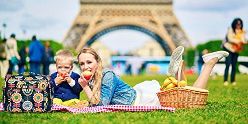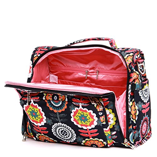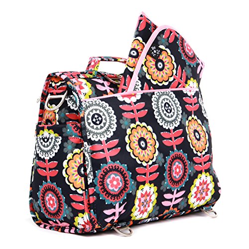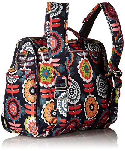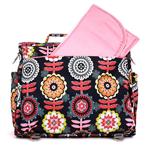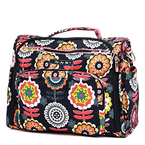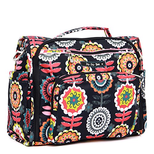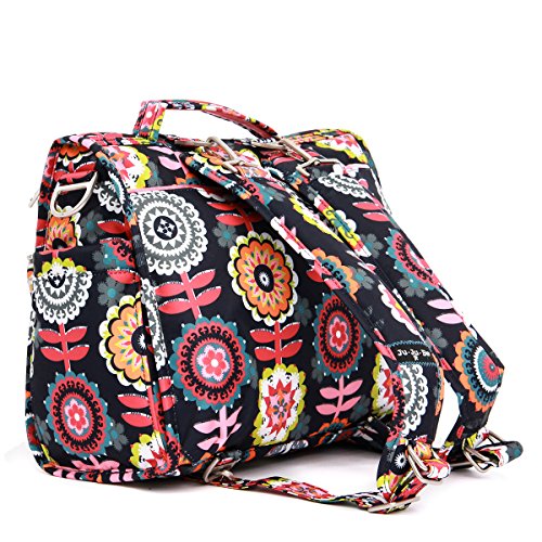 The Ju-Ju-Be B.F.F. Convertible Diaper Bag provides multiple carrying and storage options to help you stay ultra-organized. Just like your B.F.F., this machine washable backpack is something you cannot live without! Designed with convenience and comfort in mind, this versatile bag can be carried using its top handle, over-the-shoulder strap or backpack straps. The memory foam straps have textured fabric underneath to prevent the bag from slipping off your shoulder. Keep organized and sane, while never sacrificing looking good! The bag's lining is protected with Agion natural antimicrobial treatment, which inhibits and reduces the growth of odor-causing bacteria, mold and mildew. The outer fabric is treated with Teflon fabric protector, so you can repel stains and keep it clean. The front "mommy" zippered pocket is large enough for smartphones, wallets, keys attach to the key fob stretch cord, and other personal items. Inside organization includes (4) gusseted pockets, (3) zippered pockets and lots of wide open space! The main zippered pocket is large enough for diapers, wipes, extra clothes and other items. The back pocket is designed with crumb drains to keep this area clean, is large enough to store your child's books, and includs a super cushy matching memory foam changing pad. Bottle pockets are located on either side of the bag and come insulated with Thinsulate by 3M to keep your items hot or cold. The Dancing Dahlias print is a vibrant multicolored floral pattern on black fabric with bright pink lining. The print is accented by silver colored hardware, including luggage feet to keep the bottom of your bag clean when you set it down. With the B.F.F. Diaper Bag, you can choose to wear it as a backpack or messenger style - it’s your choice. Whichever you choose, the B.F.F. has your back, just like every B.F.F. should! The Ju-Ju-Be B.F.F. Convertible Diaper Bag comes with a 90-day limited warranty that protects against manufacturing defects.Feature