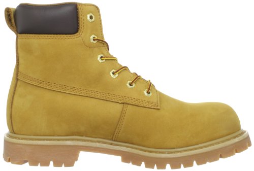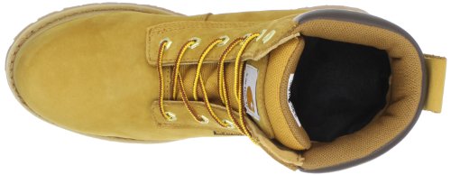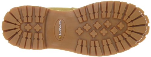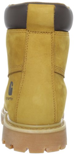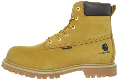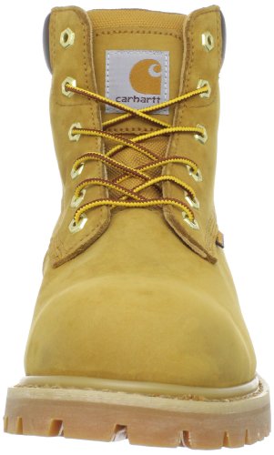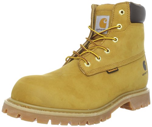 Amazon.com A hard day’s work is never easy, but the right gear can help. Like the CMW6102 6 Wheat work boot from Carhartt, which features a rugged leather upper and a metal lace-up front for a secure fit. A padded topline protects your ankle, while the thick, lugged manmade sole gives you the traction you need to get the job done. 0