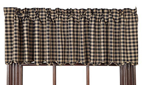 This black and khaki check valance is made of 100% cotton fabrics, comes lined and features a scalloped edge. It measures 16" in height including the 2" header and 72" width with a 3.25" rod pocket.Feature