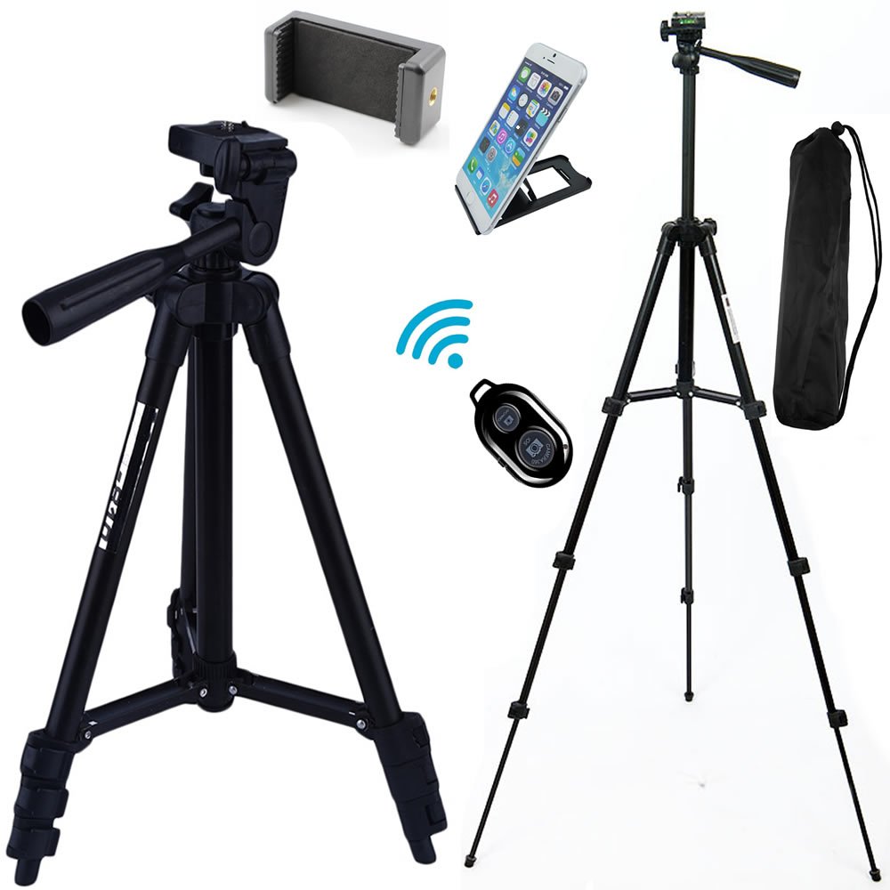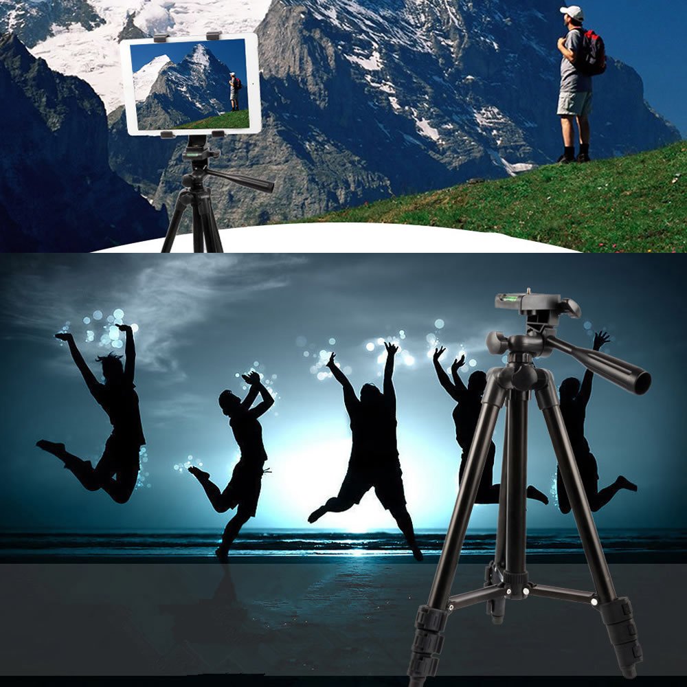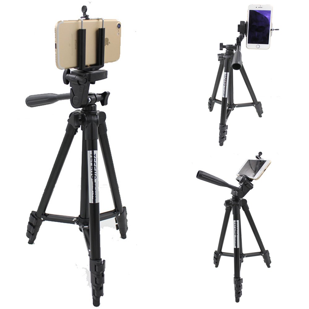 Compact lightweight aluminum tripod compatible with smartphones and cameras.