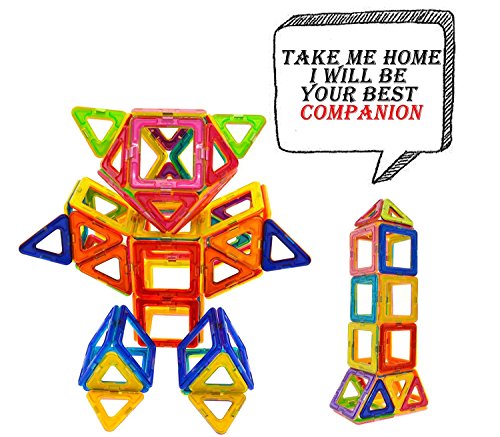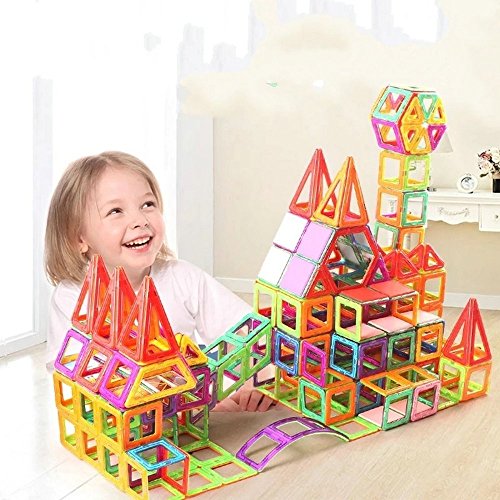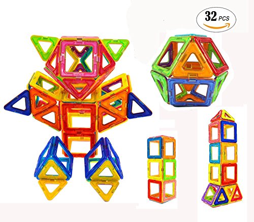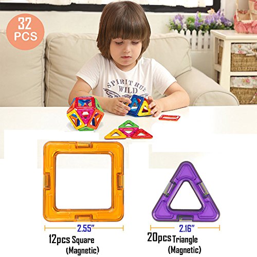 What it benefits your baby kids? 1.Manipulative Ability : Powerful magnet, newfangled structure. 2.Imagination Creativity: Opening up thinking, motivate creativity. 3.Thinking Problem Solving: Ever-changing shapes, never tired of playing. 4.Cognitive Ability: Rich colors, shaping recognition. Package including: Magnetic Triangle x 20 Magnetic Quadrangle x 12 Nonmagnetic Booklet x 1 NOTE: There are 2 different colors on each side of magnetic tile, and the colors are random. With our instruction booklet, your child can easily start building the basic forms from 2D shapes to 3D models. It's up to your imagination to build! They are both educational and entertaining. Why should you choose our magnetic tiles? * You never need to worry about safety issue while your children are playing with them. * They are easy to use. * Powerful magnets make playtime more fun and storage easier. The magnetic tiles connect to each other strongly to guarantee firm construction; when cleaned up, every piece connects to another and neatly stack benefitting cleaning and compact storage!