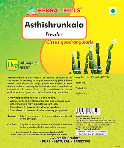 -. Binding : Health and Beauty -. Brand : Herbal Hills -. Color : Lt. brown -. EAN : 8906068410749 -. Feature : May help maintain joint & bone health. / When combined with healthy diet and exercise plan, asthishrunkala may promote weight loss. / Considered to have antioxidant properties. / Considered to have anti inflammatory properties. / Considered to be a potent antioxidant -. IsAdultProduct : 0 -. Label : Isha Agro Developers Pvt. Ltd. -. Manufacturer : Isha Agro Developers Pvt. Ltd. -. MPN : AS074 -. PackageQuantity : 1 -. PartNumber : AS074 -. ProductGroup : Health and Beauty -. ProductTypeName : HEALTH_PERSONAL_CARE -. Publisher : Isha Agro Developers Pvt. Ltd. -. Size : 1 kg -. Studio : Isha Agro Developers Pvt. Ltd. -. Title : Asthishrunkala Powder (Cissus quadrangularis)- 1 kg Pouch