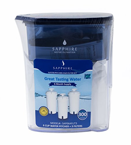 Includes a 6 cup (48 ounces) Sapphire water filter pitcher and three filters