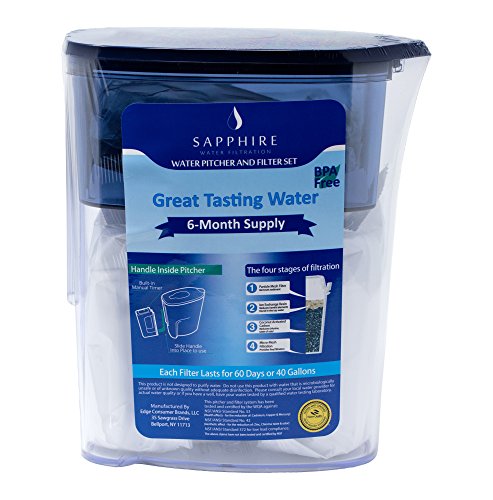 This Sapphire water filtration kit includes a 48 Ounce pitcher as well as three filters. When you reduce impurities, you're left with clean, clear, delicious water. The Sapphire water filter reduces impurities in tap water while improving the taste, smell, and clarity. It is an economically intelligent and environmentally friendly alternative to buying bottled water. The pitchers unique handle can be folded and stored in its body, saving space in your already overcrowded fridge. Not only can the replacement filers fit the Sapphire pitcher, but they also can fit Brita and PUR pitchers and water dispensers; making them truly the most diverse filter in the marketplace. These filters remove copper, mercury, and cadmium from water and reduce the chlorine taste and odor to deliver great tasting water. We love the eco-smart design. You will, too. Our water filters have been developed for maximum impact on your healthy choices, but minimal impact on our planet. Our water filters are made with 100% recyclable plastic, using 100% biodegradable filter elements to purify your water.Feature