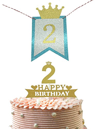 -. Feature : Perfect for Baby Girl Boy 2 years Birthday Party Decoration / Premium Quality- Imported card stock;Color:glitter gold and blue / Little assemble is needed / Package:two crown garland +1 string and 2 & happy birthday cake toppers / Size: garland is approx 6" * 8" (W*L); Cake topper 2 is 2" * 4.8" (W*L)