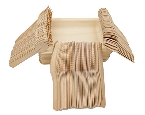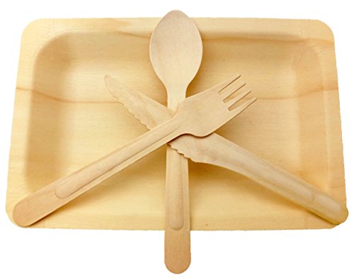 Wooden Disposable Cutlery Set of 10 Plate,10 Forks, 10 Spoons, 10 Knives, 6 inch Utensils,Biodegradable, Compostable Dinnerware,Wedding, Catering & Party Supplies(Pack of 40)