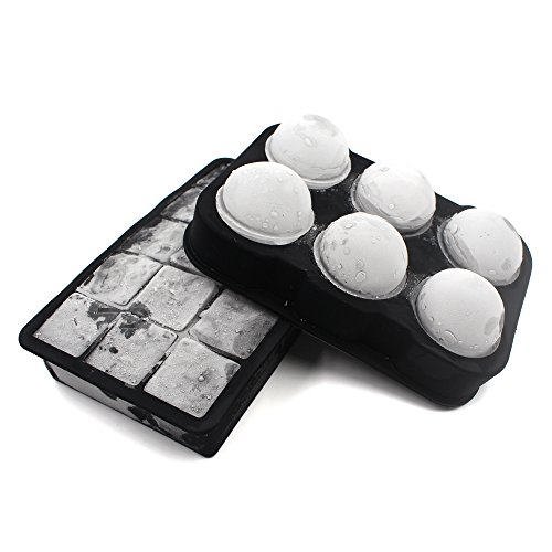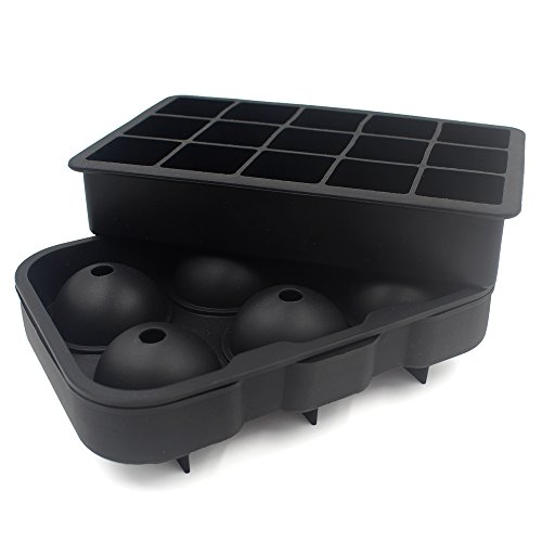 Flexible Silicone Ice Trays Molds, Round Sphere Ice Ball and Ice Cube Tray Mold Maker Combo Kit, Slowly Melt in Wine, Whiskey, Vodka, Lemonade (Black)
