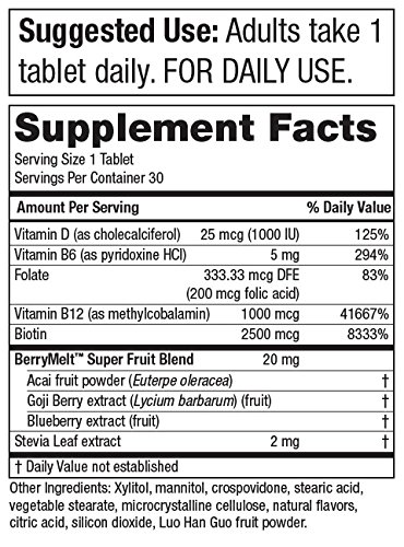 B12 Energy + Biotin BerryMeltTM AdvantageWelcome to a new way to help yourself feel energized and look great-even when you're on the go! This high potency formula combines essential B Vitamins with our unique BerryMeltTM Super Fruit Blend in a great tasting quick dissolve tablet designed for people who value overall well-being and vitality.* B12 Energy + Biotin BerryMeltTM fits easily in your purse or pocket, so no matter where you are, you have the vitamins and nutritional co-factors your body needs to stay active at your fingertips.*