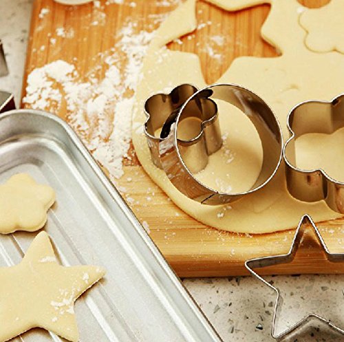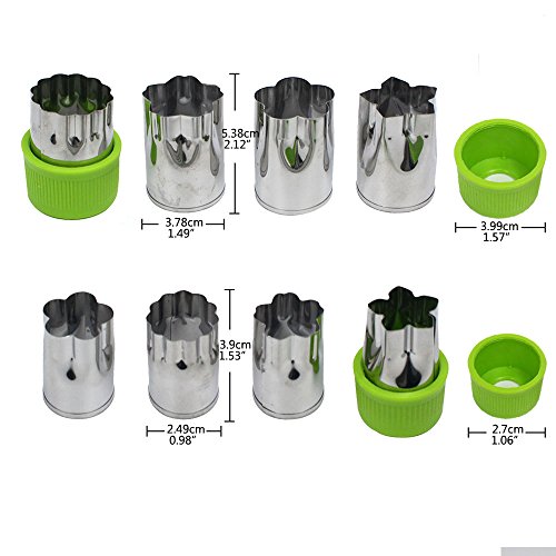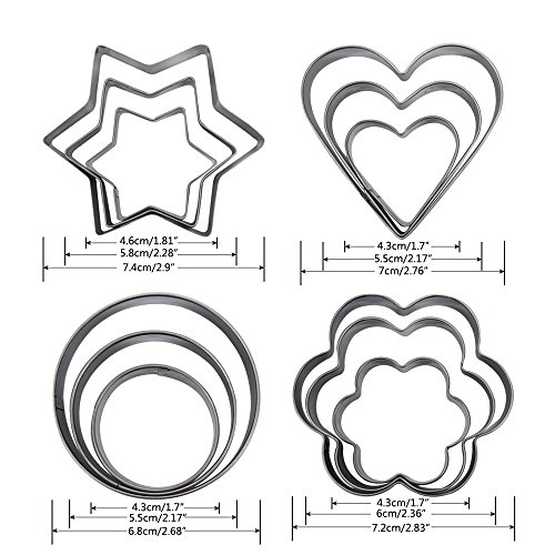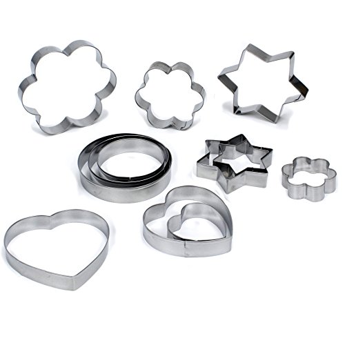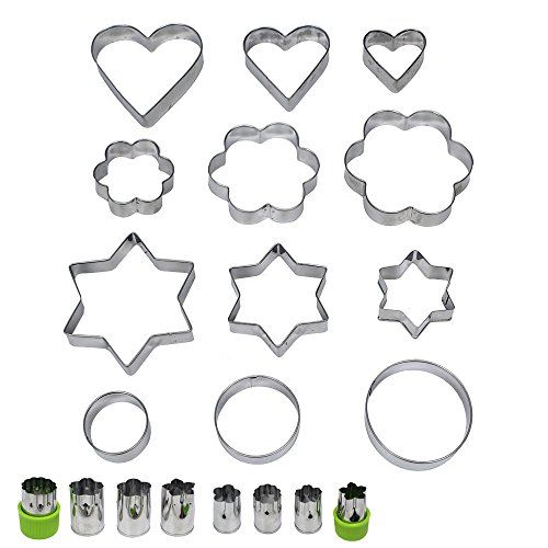 JUSLIN Set of 20 Stainless Steel Molds, 12 Metal Cookies Cutters, 3 Star-shapes, 3 Flower-shapes, 3 Round, 3 Heart-shapes (different sizes), & 8 Metal Vegetable Fruit Cutters for Food Decorations