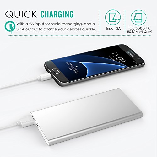 -. Feature : Convenient: Built-in Apple 8-pin Lightning connector allows you to charge your iPhone with Lightning dock whenever you need it. Never worry about not having any suitable cables around again. / Powerful: 6000mAh capacity can fully charge an iPhone 6s twice, while the dual output can charge two smartphones (iPhone + Android phone) at full speed simultaneously. / Fast Charging Technology: Charges your device quickly with a max output of 2.4A through its built-in lightning connector, definitely worth your taking on a trip, vacation, camping or outdoors for that extra juice! / Safe and Reliable: Apple MFi Certified, built-in safeguards fully protect against over-current, overcharging and overheating for safe and fast charging, without any risk of overheating or damaging with your devices. / Ultra Slim & Portable: One of the thinnest external battery travel charger, stylish and compact to easily fit into your bag to provide instant power to smartphones and tablets. Totally worry free from annoying low battaty alerts when enjoying your Pokemon Go or any other games / videos in high spirits!