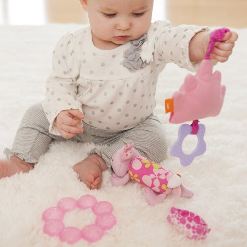 Crinkle paper inside, and attached pliable teether and rings add to the sensory fun