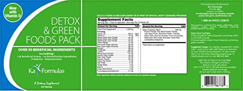 -. Binding : Health and Beauty -. Brand : Ka Formulas -. EAN : 0633131887785 -. Feature : Over 35 beneficial ingredients in substantial amounts in daily convenience packs / 20 beneficial greens / 16 Detoxification ingredients / Probiotics / Phytonutrients -. IsAdultProduct : 0 -. Label : Pre Mark -. LegalDisclaimer : We recommend that you do not solely rely on the information presented and that you always read labels, warnings, and directions before using or consuming a product. For additional information about a product, please contact the manufacturer. Content on this site is for reference purposes and is not intended to substitute for advice given by a physician, pharmacist, or other licensed health-care professional. You should not use this information as self-diagnosis or for treating a health problem or disease. Contact your health-care provider immediately if you suspect that you have a medical problem. Information and statements regarding dietary supplements have not been evaluated by the Food and Drug Administration and are not intended to diagnose, treat, cure, or prevent any disease or health condition. Amazon.com assumes no liability for inaccuracies or misstatements about products. -. Manufacturer : Pre Mark -. PackageQuantity : 1 -. ProductGroup : Health and Beauty -. ProductTypeName : HEALTH_PERSONAL_CARE -. Publisher : Pre Mark -. Studio : Pre Mark -. Title : Ka Formulas Detox & Green Foods Pack -. UPC : 633131887785