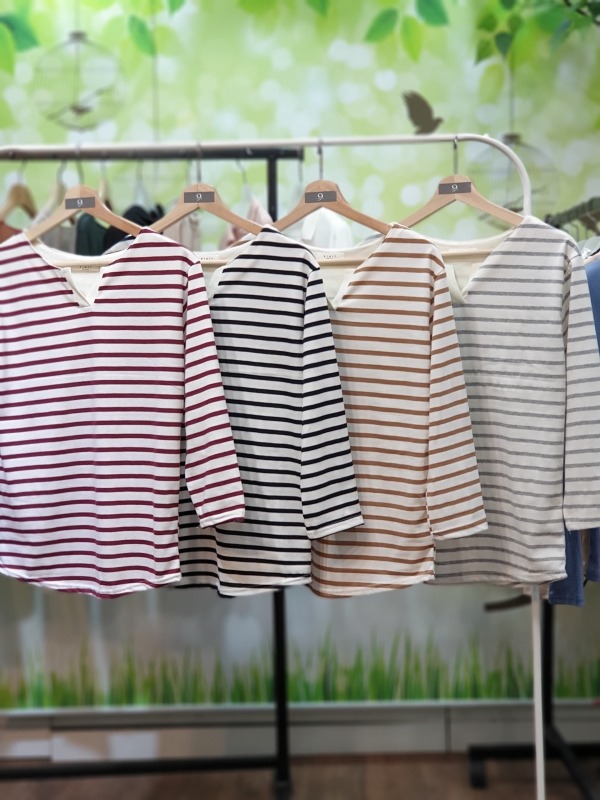 브이넥으로 포인트를 주었고 목라인에 이중 안감으로 부드러움을 주었어요 손목과 허리라인에 깜끔한 이중 마감으로 늘어나는 걱정없이 편하게 입을수 있어요 아이보리 바탕에 회색, 모카, 와인, 검은색 패턴으로 센스있는 배색이 돋보이는 디자인이예요 코튼팬츠부터 데님 , 슬팩스등 어떤 하의와 매치하느냐에 따라 캐쥬얼부터 트렌드하게 다양한 느낌을 연출 할 수 있어요 군더더기 없이 심플 한 디자인과 세련된 배색 스트라이프 패턴, 타이트 하지 않는 적당히 루즈한 품까지 편하게 즐겨입기 좋은 데일리 티셔츠 입니다 가격까지 완전 굿!!!!!