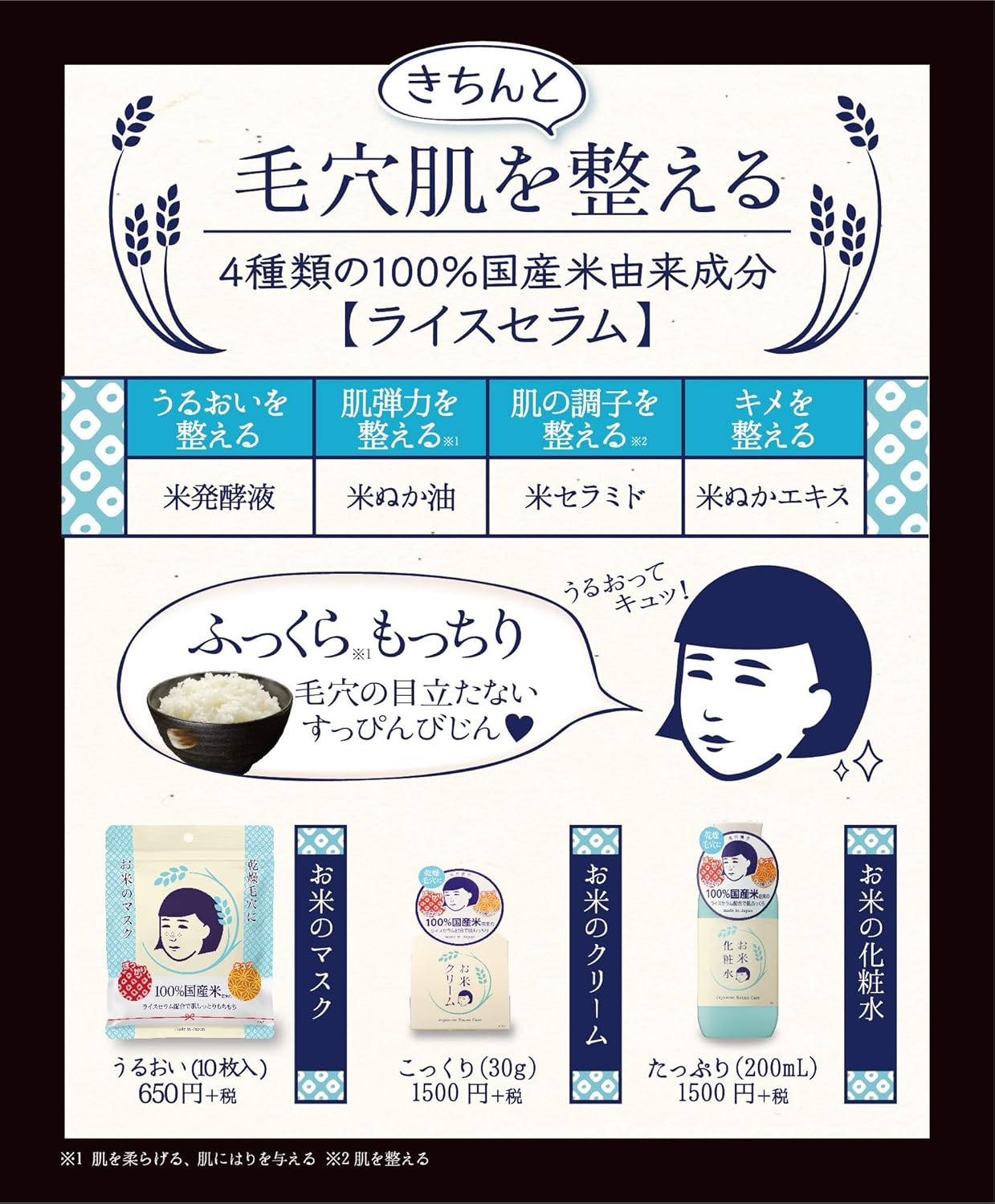 | 成分 | 水、グリセリン、PG、エタノール、(スチレン/ビニルピロリドン)コポリマー、コメ発酵液、コメヌカ油、加水分解コメヌカエキス、コメヌカスフィンゴ糖脂質、グルコシルセラミド、α-グルカン、BG、キサンタンガム、ポリソルベート80、クエン酸、クエン酸Na、フェノキシエタノール、メチルパラベン |