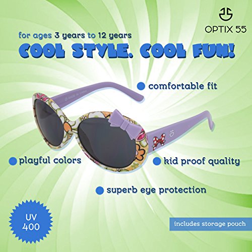 Product Description STYLISH UV PROTECTION FOR KIDS At the beach or on the go, even when it's overcast, the sun's rays are always beating down on us. But those sunny rays that feel so great on our skin can be damaging, especially to your child's sensitive eyes. Protect their eyes in style with these cool smoked sunglasses from Optix 55 which are designed specifically to fit children from 3 to 12 years old. PRODUCT FEATURES: ? 100% UV Protection ? Smoked Lenses ? Neutralizes Glare So Objects Appear Clearer Brighter ? Durable Construction ? Assorted Colors Styles ? Durable Design For Long-lasting Performance ? Ages 3-12 ? Perfect For High Impact Activities ? Matching Pouch Included SAFE COMFORTABLE FUN IN THE SUN Our smoked sunglasses are designed to be fun to wear while protecting against the sun's harmful rays. The smoked lenses offer protection from UV rays neutralize glare, so your child can see objects clearly in sunny weather avoid potential hazards in the environment. These glasses are durable, so they can stand up to the busy play style of older children. The included carry pouch is also a great way to keep their glasses looking like new when not in use and the fun matching design on the glasses case makes it something they'll enjoy using. VIBRANT COLOR COMBINATIONS! Every child has their own unique sense of style, so why not let them express it with their sunglasses. Our glasses come in a variety of fun color combinations, so you can mix match to fit your wardrobe. Available In The Following Styles: - Round Ombre Sunglasses (Assorted Colors) - Wayfarer Sunglasses (Assorted Colors) - Oversized Sunglasses (Assorted Colors) - Patterned Wayfarer Sunglasses (Assorted Colors) - Polka Dot Square Sunglasses (Assorted Colors) - Floral Oval Sunglasses (Assorted Colors) This season protect your eyes in style with Optix 55's Sunglasses For Kids! 0