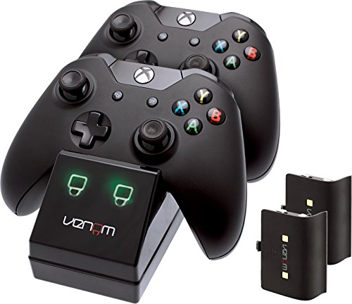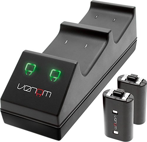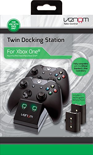 -. Binding : Accessory -. Brand : Venom -. EAN : 5031300028512 -. Feature : Dock, store and fast charge your XBOX One Controllers / Keep controllers fully charged and ready to use / Supplied with 2 x 700 Nimh rechargeable battery packs / Red LED charge indicators turn to green once controllers are fully charged / Compatible with Elite Controller as well as standard official controllers -. Label : PLAYCOM SOFTWARE VERTRIEBS GMBH -. Manufacturer : PLAYCOM SOFTWARE VERTRIEBS GMBH -. Model : M1AEACVEN02851 -. MPN : VL028512 -. OperatingSystem : XBOX One -. PackageQuantity : 1 -. PartNumber : VL028512 -. Platform : Xbox One -. ProductGroup : Video Games -. ProductTypeName : ABIS_VIDEO_GAMES -. Publisher : PLAYCOM SOFTWARE VERTRIEBS GMBH -. Studio : PLAYCOM SOFTWARE VERTRIEBS GMBH -. Title : Venom Xbox One Twin Docking Station with 2 x Rechargeable Battery Packs: Black (Xbox One)