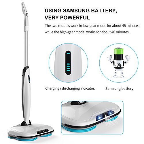 Secure and Humanization Design The high powered electronic spin is with mirco-computer control, low battery protect, full charge indicator, this spin mop can indicate the power, it can remind you when will you need to charge it,it is designed and engineered to make cleaning a breeze in less amount of time.