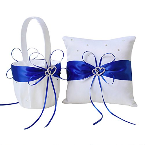 AmaJOY 5pcs Sets Wedding Guest Book + Pen Set + Flower Basket + Ring Pillow + Garter, White Cover, Double Heart Rhinestone Decor Royal Blue Ribbon Bowknot Elegant Wedding Ceremony