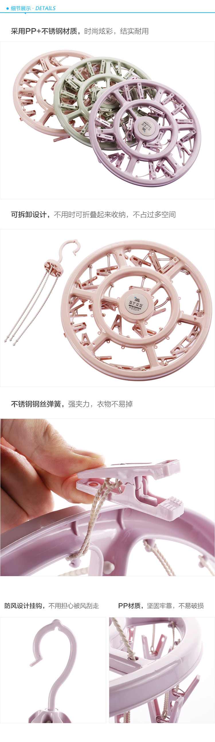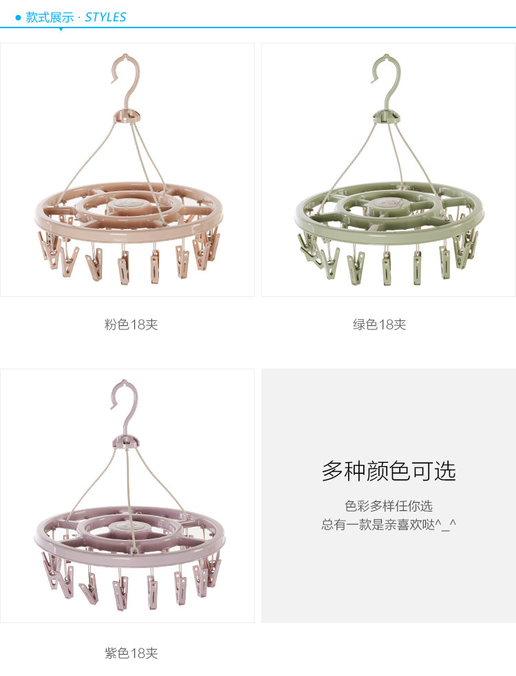 采用PP材质,无污染,能牢牢夹住物品不易脱落,360°自由旋转挂钩,更方便晾晒衣物!