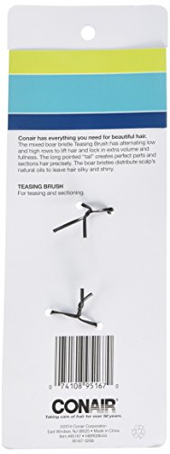 -. Binding : Health and Beauty -. Brand : Conair -. Color : Black -. EAN : 0074108951670 -. Feature : Alternating low and high bristle rows help lift hair / Boar bristles distribute your hair's own oils for a silky salon look / Add volume and lock in fullness for a variety of styles / Section hair precisely for sharp parts or styling / Great for teasing and lift in casual day looks or evening undo's -. IsAdultProduct : 0 -. Label : Conair -. Manufacturer : Conair -. Model : 95167 -. MPN : 95167 -. NumberOfItems : 1 -. PackageQuantity : 1 -. PartNumber : 95167 -. ProductGroup : Beauty -. ProductTypeName : BEAUTY -. PublicationDate : 2013-01-17 -. Publisher : Conair -. Studio : Conair -. Title : Conair Slim Teasing Hair Brush, Mixed Boar Bristle -. UPC : 885537278951
