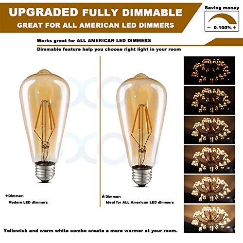☛UPGRADED DIMMABLE DRIVER---Upgrade dimmable driver with full dimmable available of LED Edison light bulbs , which are flicker-free, silent and have smooth dimming capabilities from 0-100% with ALL DIMMERS. The feature of fully dimmable Edison light bulbs have longer lifespan, more durable and stabler than original dimmable LED light bulbs. Fully dimmable edison bulbs will allow you to create the perfect balance of vintage light !