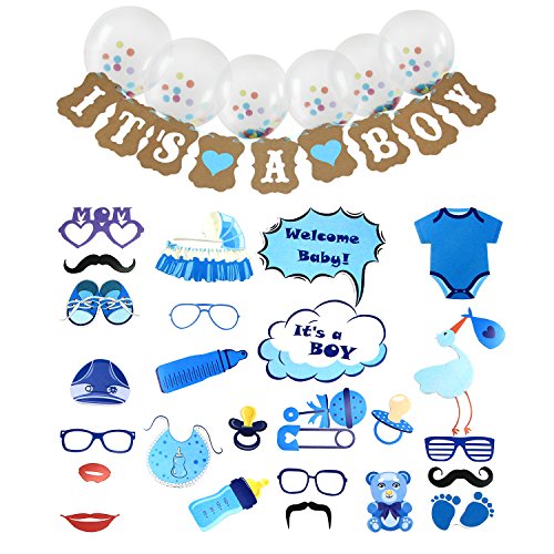 AMZTM Baby Boy Shower Birthday Party Decorations 27 PCS Photo Booth Props + 1 PCS IT'S A BOY Banner + 6 PCS 12'' Balloons (Blue, 34)
