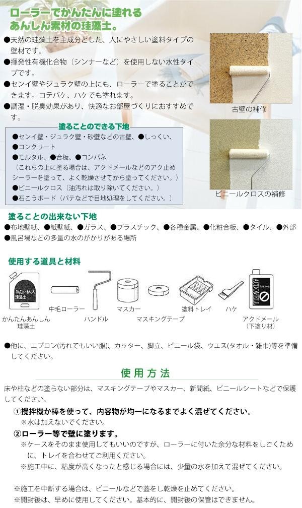 | 天然の珪藻土を主成分とした、人にやさしい塗料タイプの壁材で、揮発性有機化合物(シンナーなど)を使用しない水性タイプです。センイ壁やジュラク壁の上にもローラーで塗ることができます。コテバケ・ハケでも塗れます。調湿・脱臭効果があり、快適なお部屋づくりにおすすめです。6畳間がほとんど塗れるお徳用です。別売りの下地処理剤「アクドメール」をご使用いただければ、より綺麗な仕上がりになります。 |