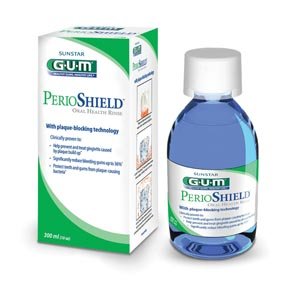 Studio : Sunstar Publisher : Sunstar Binding : Misc. Product Description Gum perioshield is a breakthrough next-generation oral rinse. A proprietary active ingredient (delmopinol 0.2 percent ) in gum perioshield breaks down plaque, making it easier to remove and also creates an invisible barrier that blocks plaque from forming on your teeth and gums. It is clinically proven to help reduce plaque build-up and bleeding gums by up to 36 percent ! data on File. 0