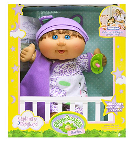 Adopt your very own Cabbage Patch Kid 12.5'' baby. Every Naptime baby is born at Babyland General Hospital and each comes ready for love with a cozy blanket, a pacifier or bottle and contemporary and cute baby fashions. Get ready to snuggle and take the Oath of Adoption. Find your special baby to adopt today! 1) 12.5'' Cabbage Patch Kid Baby. 2) Improved fashions with new fun prints 3) Each baby includes an adorable blanket and a pacifier or bottleFeature
