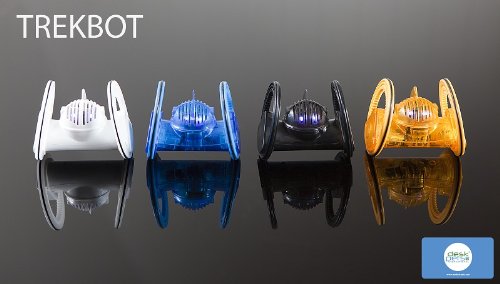 This is the Desk Pets TrekBot Remote Controlled Hubless 2WD Robot. It is a hubless wheeled robot that is controlled by a unique patent pending 5 button USB remote controller/charger. Trekbot moves forward, backwards, turns left, turns right and stops, as well as does headstands and flips.
