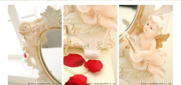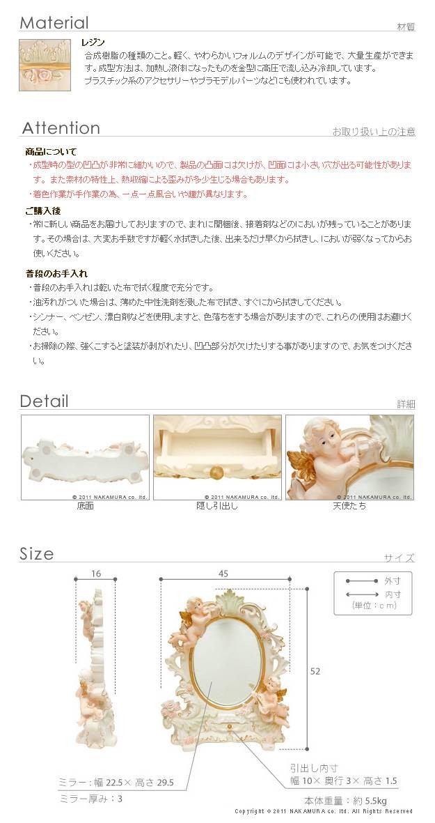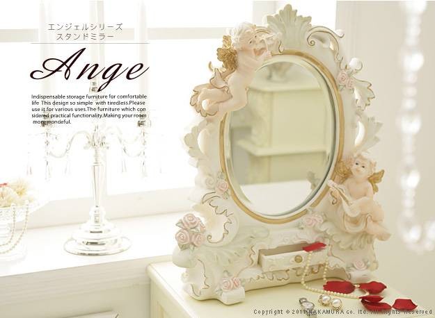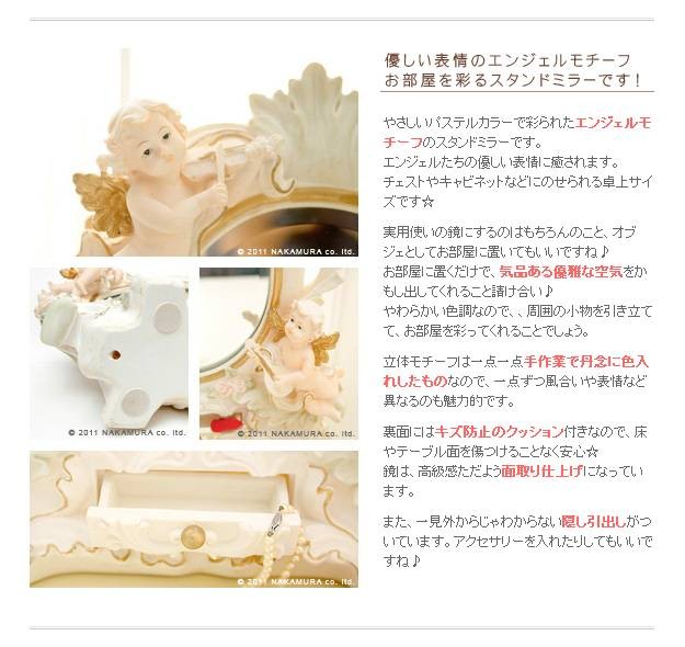 商品について:エンジェルモチーフのスタンドミラー。卓上サイズなので実用でも・・お部屋のインテリアとしてもOK!立体モチーフは一点一点手作業で色入れしたものなので、それぞれ趣きが異なるのも魅力的です。