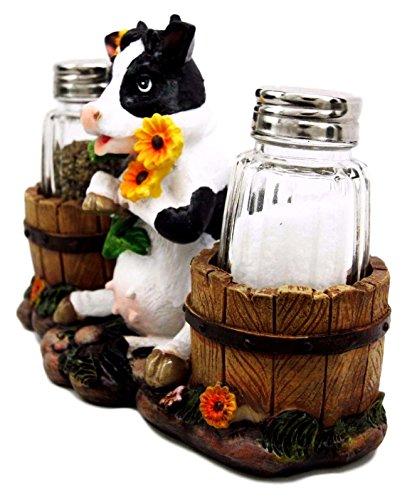 Ebros Gift Lovely Sunflower Cow With Old Country Farm Milk Barrels Decorative Glass Salt Pepper Shakers Holder Resin Figurine 7" Wide