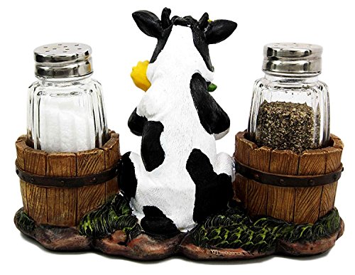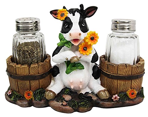 This Sunflower Cow salt pepper shaker set is made of high quality polyresin, hand painted and polished. They are equipped with two glass shakers as pictured without the condiments.