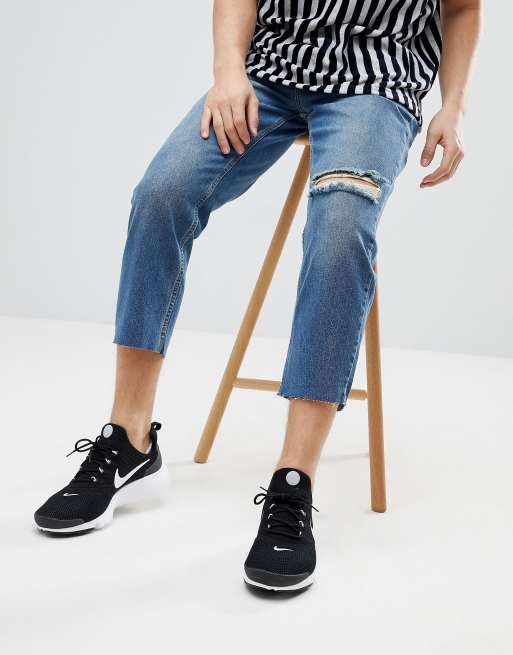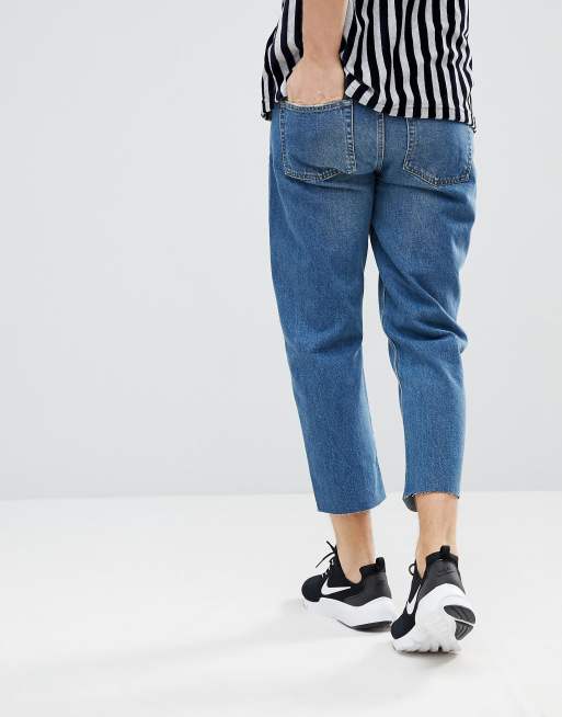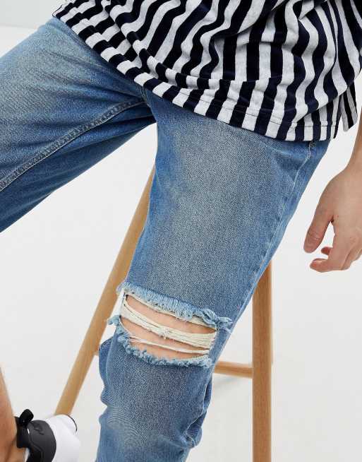 Mennace Tapered Jeans In Midwash Blue With Knee Rip
